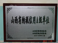 2011年1月25日,我公司榮獲省國稅、地稅聯(lián)合頒發(fā)的“山西省納稅信用A級單位”榮譽(yù)稱(chēng)號。