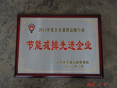 2012年2月8日,在山西省道路運輸工作會(huì )議上,我公司獲得由山西省交通運輸管理局頒發(fā)的2011年度全省道路運輸行業(yè)《節能減排先進(jìn)企業(yè)》榮譽(yù)稱(chēng)號。