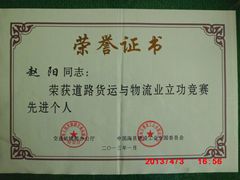 2013年4月2日,公司董事長(cháng)趙陽(yáng)在“道路貨運與物流業(yè)立功競賽”活動(dòng)中,被交通運輸部辦公廳和中國海員建設工會(huì )全國委員會(huì )聯(lián)合授予“先進(jìn)個(gè)人”榮譽(yù)稱(chēng)號。