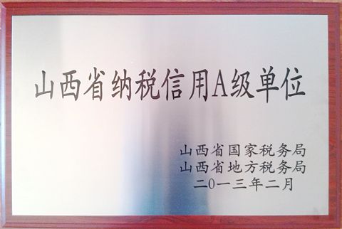 2014年元月15日,我公司榮獲省國稅、省地稅聯(lián)合頒發(fā)的“山西省納稅信用A級單位”榮譽(yù)稱(chēng)號。