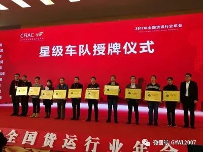 2018年1月25日—27日,中物聯(lián)公路貨運分會(huì )召開(kāi)2017年全國貨運行業(yè)年會(huì ),我公司應邀參加,并被大會(huì )評為首批中國公路貨運四星級車(chē)隊,標志著(zhù)公司公路貨運組織化及優(yōu)質(zhì)運力得到中物聯(lián)認可,同時(shí)樹(shù)立物流行業(yè)標桿,為公司開(kāi)拓市場(chǎng)提供強有力的資質(zhì)保障。