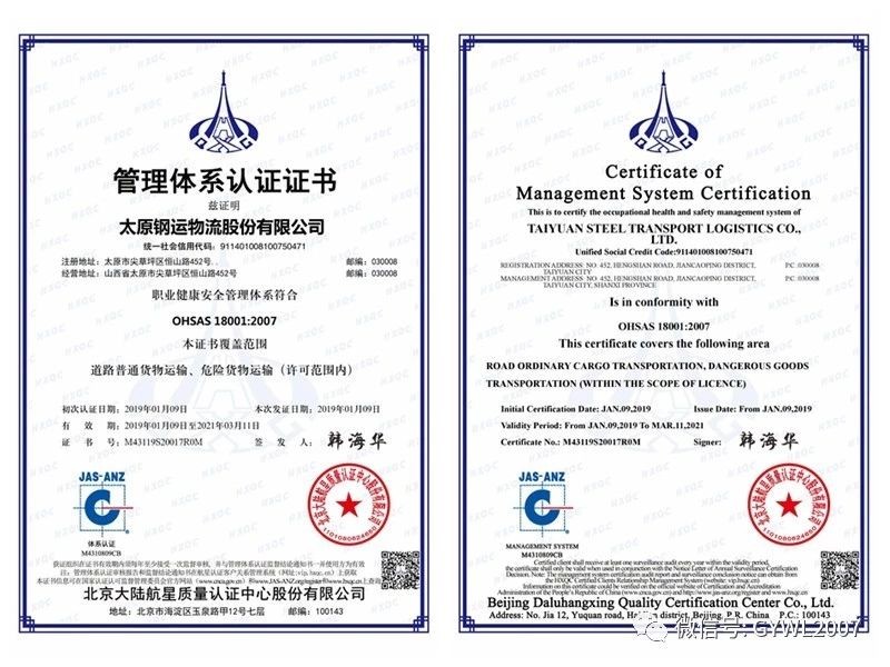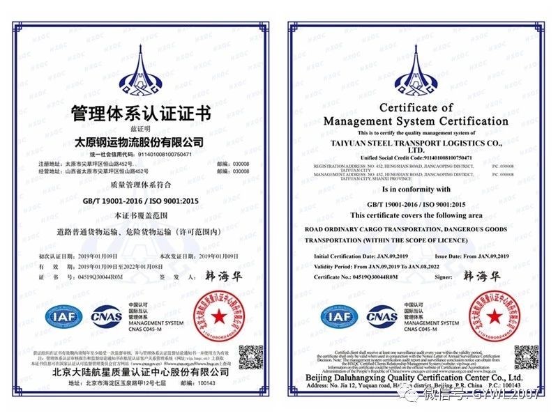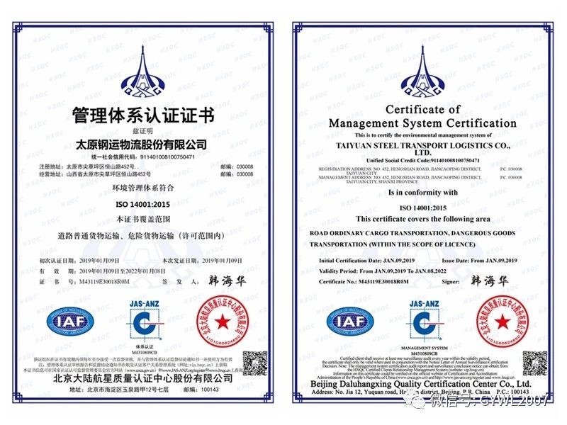 2019年1月,公司通過(guò)ISO9001質(zhì)量管理體系、ISO14001環(huán)境管理體系、ISO18001職業(yè)健康安全管理體系認證。ISO三標一體認證的通過(guò),標志著(zhù)公司始終踐行推進(jìn)冶金物流服務(wù)本質(zhì),持續強化以用戶(hù)為中心的服務(wù)理念;充分反映公司全力打造綠色****物流企業(yè)發(fā)展規劃的堅定決心,同時(shí)通過(guò)提高職業(yè)健康安全管理水平、優(yōu)化管理流程、完善管理體系、規范作業(yè)標準等手段提升公司競爭力,為公司開(kāi)拓市場(chǎng)、永續發(fā)展提供了有力保障。